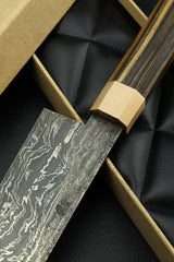 Blade: Hand forged damascus, 63 HRC, 180 mm