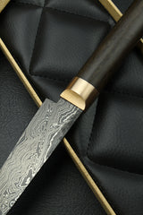 The pith rays of the thousand-year-old bog oak shine through the handle of the Petty. Only the smell betrays the natural and ecologically justifiable stabilisation with larch and spruce resin against moisture and odours.