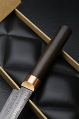 The pith rays of the thousand-year-old bog oak shine through the handle of the Petty. Only the smell betrays the natural and ecologically justifiable stabilisation with larch and spruce resin against moisture and odours.