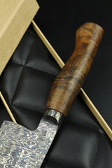The Kukasian walnut handle picks up the pattern from the Damascus steel again and continues it in a natural way to the end of the handle.