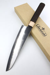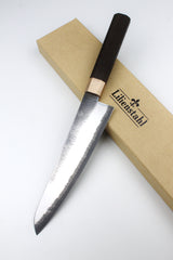The pith rays of the thousand-year-old bog oak shine through the handle of the Gyutoh. Only the smell reveals the natural and ecologically sound stabilisation with larks and spruce resin against moisture and odours.