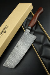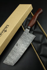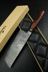 This Lilienstahl Nakiri is forged out of 520 layers Damascus-steel and finished with a snakewood handle.