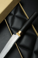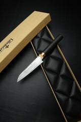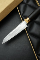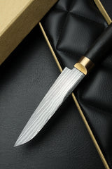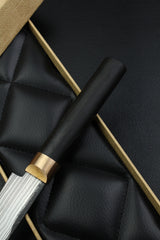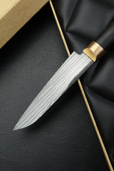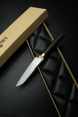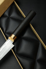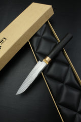 The pith rays of the thousand-year-old bog oak shine through the handle of the Petty. Only the smell betrays the natural and ecologically justifiable stabilisation with larch and spruce resin against moisture and odours.