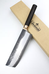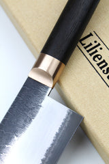 The pith rays of the thousand-year-old bog oak shine through the handle of the Nakiri.