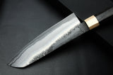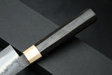 The pith rays of the thousand-year-old bog oak shine through the handle of the Santoku. Only the smell betrays the natural and ecologically justifiable stabilisation with larch and spruce resin against moisture and odours.