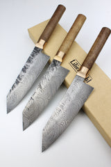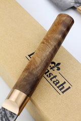 Die Klingenform entspricht dem V1, diesmal jedoch aus Damaststahl gefertigt. Die Schmiedehaut verleiht der Klinge eine entkohlte Randschicht, wodurch der Klingenrücken eine höhere Elastizität erhält und die Bruchfestigkeit deutlich steigt. Gleichzeitig bleibt so der ursprüngliche Schmiedeprozess sichtbar und in der fertigen Klinge nachvollziehbar. Damaststahl zählt zu den edelsten Materialien für Kochmesser.