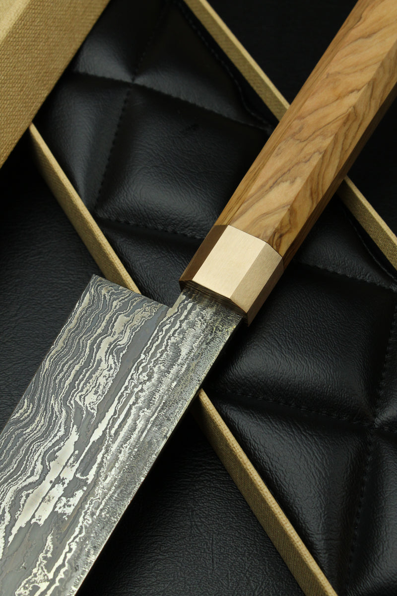 Blade: Hand forged damascus, 63 HRC, 180 mm