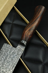 This Santoku was forged in our Soundwave pattern. The blade thickness of 2.1 mm at the bolster makes it easy to handle. Every gram counts in a marathon or a cycling race, but weight is also an absolute factor in top gastronomy, where the knife should even exceed the chef's expectations in order to be a good tool. Our grinds are known in the trade as flat grinds with a slightly convex design to increase stability. This ensures a cutting experience with virtually no cutting resistance. In this way, we achieve a light yet large working tool. The macassar wood serves as a handle and adorns the unique Damascus.